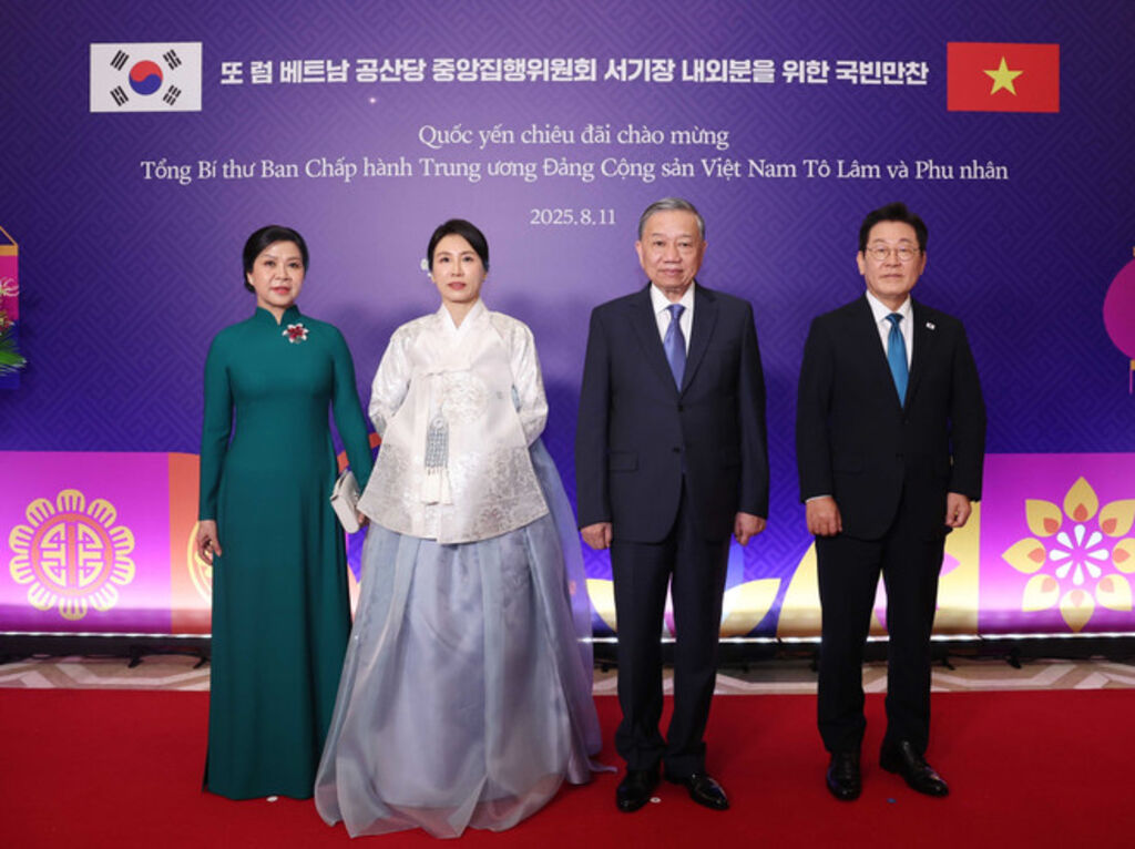 Party General Secretary To Lam, his spouse Ngo Phuong Ly, and a high-ranking Vietnamese delegation attended a state dinner hosted by President of the Republic of Korea (RoK) Lee Jae Myung and his spouse on August 11.