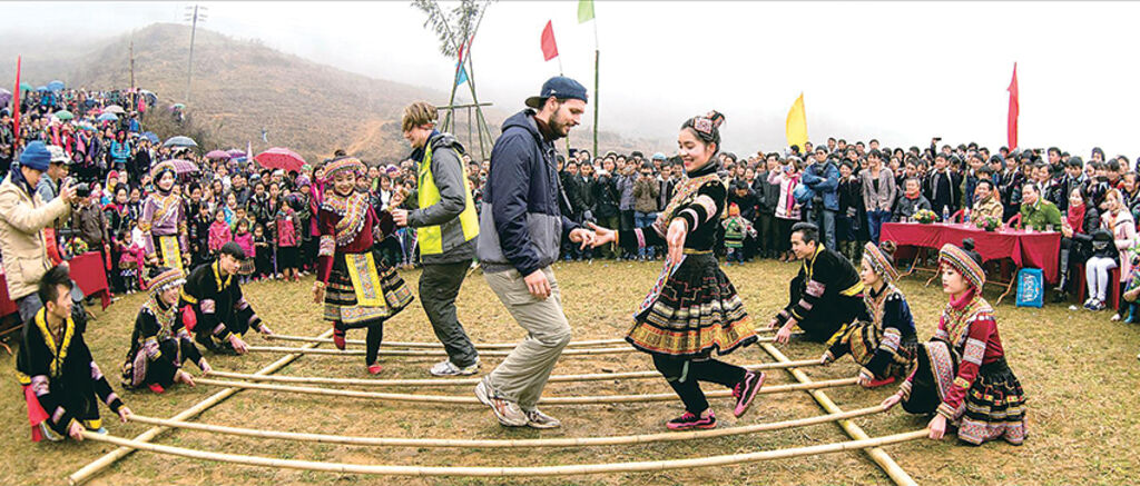 | Tourists join ethnic girls in a dance with bamboo poles called “sap” in a Sa Pa festival.__Photo: Pham Bang/VNA |