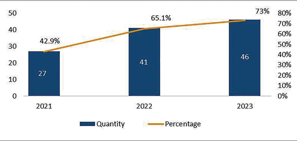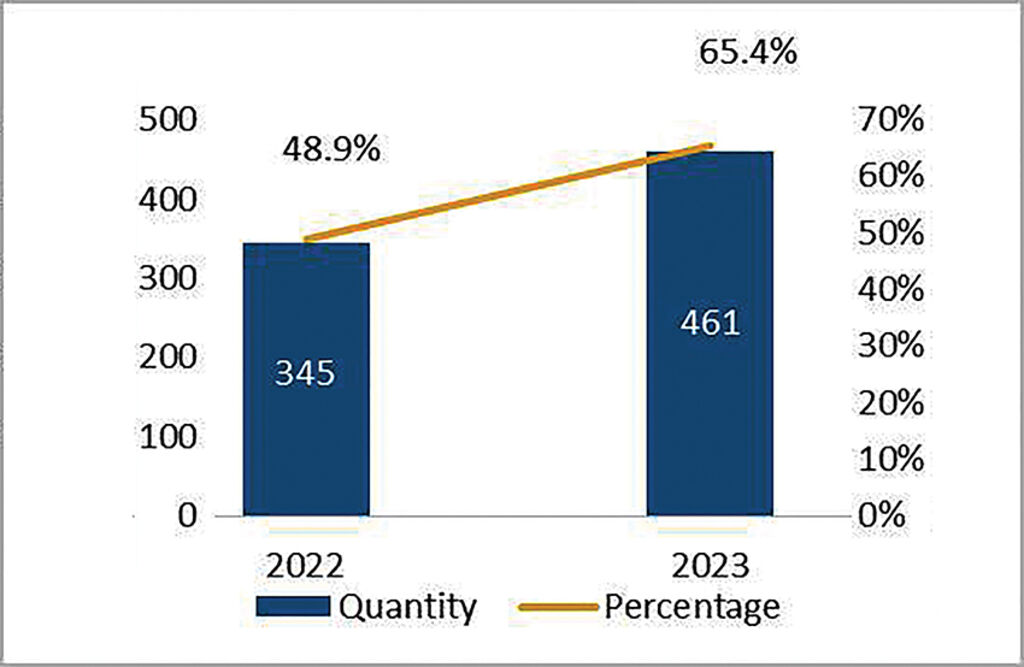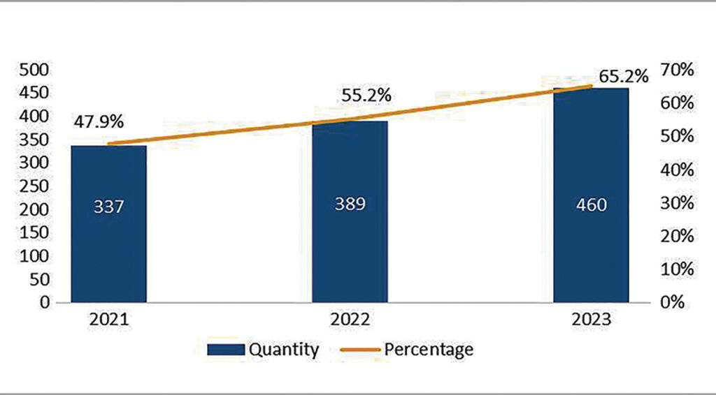 Similar to the disclosure of PLLPFs and DLLUMPs, the proportion of annual DLLUPs found on DPCs’ portals also increased in 2023 compared to 2021 and 2022. As Figure 4 shows, DLLUPs were found on 337 DPCs’ portals (47.9 percent) in 2021, and on 389 DPCs’ portals (55.2 percent) in 2022. In the third review, the 2023 DLLUPs were found on 460 DPCs’ portals, accounting for 65.2 percent of all 705 DPCs nationwide, or an increase of 17.3 percent compared to the 2021 review and 10 percent compared to the 2022 review.