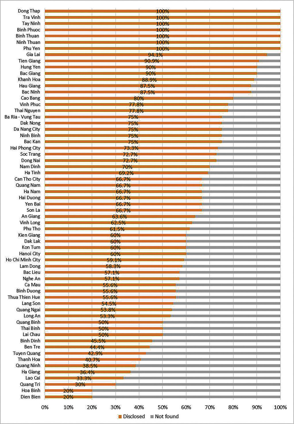 Figure 5 reveals the proportion of DPCs from each of all 63 provinces that disclosed the 2023 DLLUPs on their portals. Accordingly, seven provinces, namely Dong Thap, Tra Vinh, Tay Ninh, Binh Phuoc, Binh Thuan, Ninh Thuan and Phu Yen, had all DPCs disclosing their DLLUPs on their portals. At the other end of the spectrum, Hoa Binh and Dien Bien are the two provinces with the lowest number of DPCs disclosing their DLLUPs online, at only 20 percent.