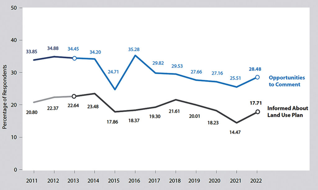 PAPI findings since 2011 have shown that, every year, below 20 percent of respondents are aware of local land use plans, and below 40 percent would know local land pricing frameworks. Particularly, The 2022 PAPI survey results again show how informed citizens were about land plans that may result in land seizures. Notably, as shown in Figure 1,[4] the percentage of respondents who reported being informed about annual district land use plans in 2022 remained low at 17.7 percent, despite a slight 3-percent increase from 2021. Also, the percentage of those who were invited to provide comments on the local land plans was at 28.5 percent, also a rise of 3 percent from 2021. One possibility is that citizens were less likely to demand information about land plans if they were less concerned about the possibility of having land seized. Another possibility is that many local governments did not update and disclose annual local land plans.