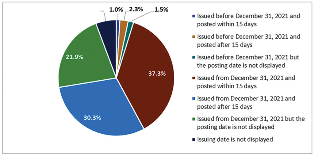 Also, as shown in Figure 3, under the regulations on the due date for disclosing DLLUPs online, of 19 DPCs that issued their DLLUPs on time, only four disclosed on time; nine disclosed later than regulated; six disclosed but did not show the dates of disclosure on their portals. Out of 348 DLLUPs that were issued on or after December 31, 2021, 145 DLLUPs (37.3 percent) were disclosed on time; 118 DLLUPs (30.3 percent) were disclosed 15 days after the date of issuance, and 85 DLLUPs (21.9 percent) were uploaded without specified disclosing dates on DPCs’ portals.