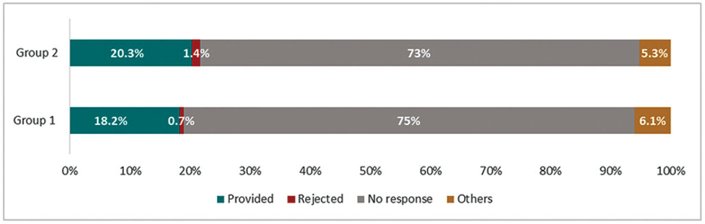 Furthermore, between the two groups of letters of request for information, the letters citing the Law on Access to Information (Group 1) received fewer informative responses (51 responses) than those of Group 2 citing the Land Law (57 responses). Group 1 received two rejection responses and 17 other responses, and Group 2 received four rejection responses and 15 other responses. The response findings of the two groups are shown in Figure 4 below.