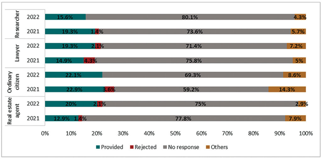 Regarding the level of response in relation to the roles of the requesters, Figure 5 shows the findings of comparing the response level according to each role of the requesters in the two review rounds. Accordingly, the percentage of DPCs providing information to citizens remained almost unchanged; increasing by about 7 percent and 4.4 percent for the real estate trader and the lawyer, respectively; and decreasing by 3.7 percent for the researcher. For all the four requesting roles, the percentage of DPCs not responding to information requests remained high.