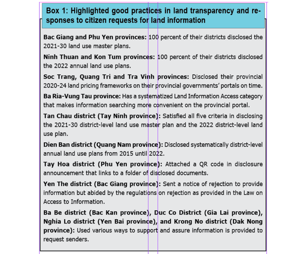 The survey findings on provincial and district portals for two consecutive years of 2021 and 2022 show that the number of PPCs that disclosed PLLPFs and the number of DPCs that publicized DLLUPs increased over time. In addition, the number of DPCs responding to information requests in the second-year experiment increased compared to that of the first-year review. There are good practices at the provincial and district levels. Box 1 below highlights such good practices for other provincial and district governments to learn from.