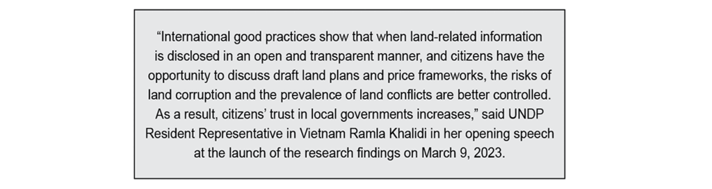 In short, full and timely disclosure of PLLPFs, DLLUMPs and DLLUPs is one of the solutions contributing to reducing current land conflicts. With the growing trend of digital transformation and the high rate of internet users in Vietnam, portals of state agencies are gradually becoming common “places” for people to find information. If designed strategically and synchronously, portals of state agencies, in particular at the district level, will be an effective communication channel between the people and the government.