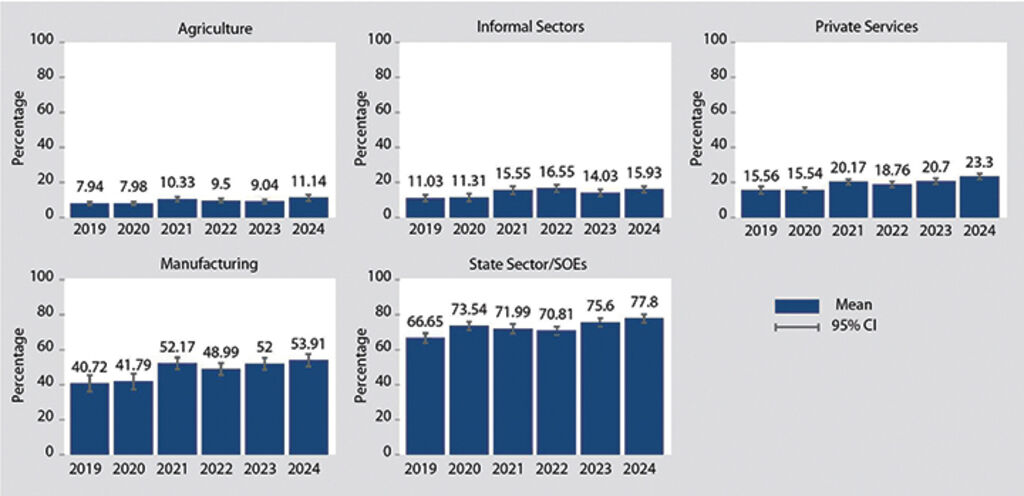 The incremental change from 2019 to 2024 is also seen in major sectors, such as agriculture, informal sectors, private services, manufacturing, and state-owned enterprises (SOEs). As Figure 2 reveals, for instance, the coverage rose from 15.56 percent to 23.3 percent in private services, from 40.72 percent to 53.91 percent in the manufacturing sector, and from 66.65 percent to 77.8 percent in the state sector and SOEs over the period of six years. Some of this may be due to an increase in state and private firms complying with compulsory social insurance contributions.