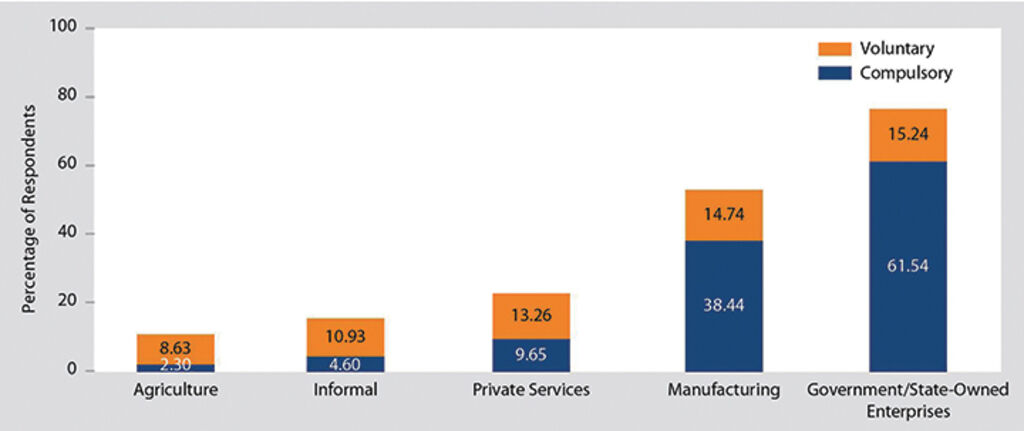 As presented in Figure 3, for respondents working in the state sector and SOEs, 76.78 percent reported having social insurance, with 61.54 percent covered by compulsory insurance. In manufacturing, 53.18 percent of PAPI participants reported purchasing social insurance, with 38.44 percent holding compulsory insurance. In contrast, for agriculture workers, only 10.93 percent have social insurance, with 8.63 percent buying voluntary insurance.