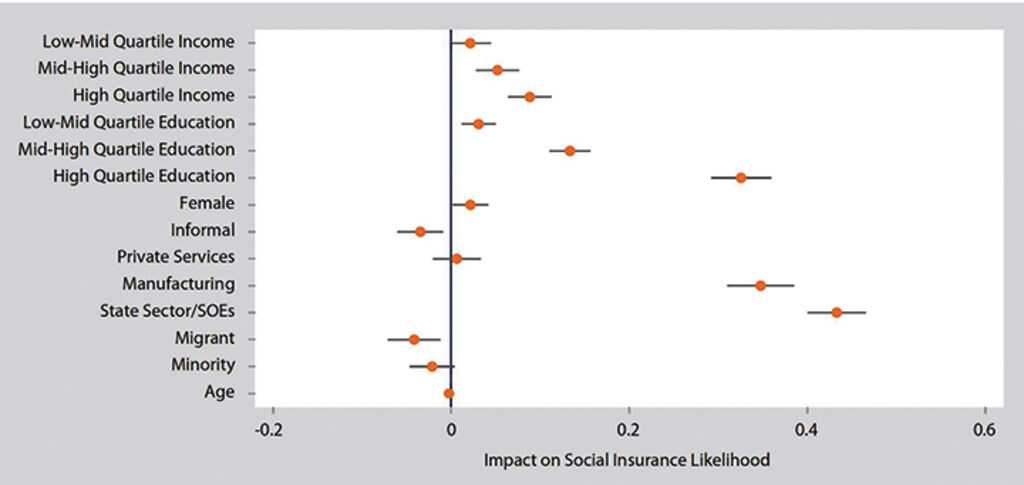 When disaggregated by levels of income, education, economic sectors, and demographic features, respondents in manufacturing, the state sector and SOEs tend to have social insurance coverage, as do those with higher education levels and income. As Figure 4 further illustrates, those working in the informal sectors and private services – the majority of workers surveyed in PAPI – do not have social insurance of any type. Moreover, migrant employees and ethnic minorities are less likely to access social insurance.