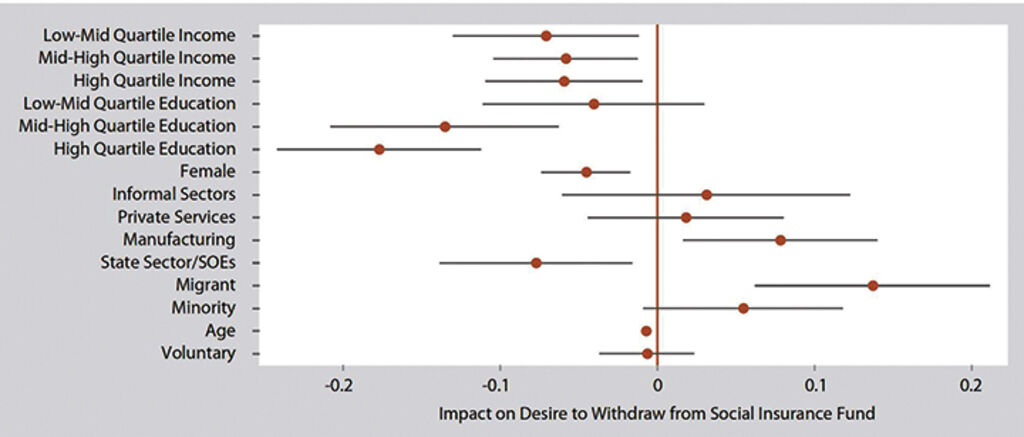 As illustrated in Figure 6, this preference was less common among those with higher income and education level, and those employed in the state sector and SOEs. Migrants and manufacturing sector workers expressed the strongest desire for withdrawals, followed by ethnic minorities and men, who are compared to women in the graph.