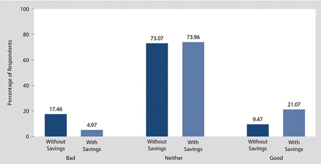 This section reveals how a lack of savings could impact citizens’ perceptions of household economic vulnerability. Figure 7 shows that among respondents with neither savings nor social insurance, 17.46 percent said their household economic situation was “bad”, four-fold higher than those with savings. Only 9.47 percent without savings said their household economic situation was “good” compared to 21.07 percent with savings. Statistical analysis shows that even when accounting for income level, economic sector, and other factors that correlate with low savings, the lack of savings still increases household economic concerns.
