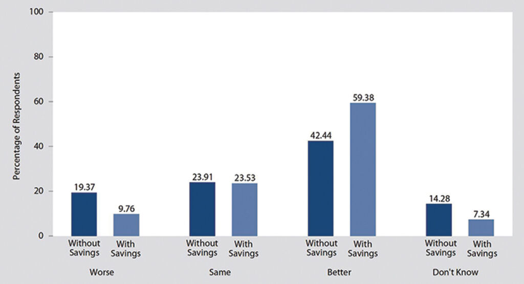 The same patterns can be seen in assessment of future household economic conditions in the next five years: with 59.38 percent of those with savings believing their economic situation would brighten, around 17 percent higher than those without savings. Figure 8 reveals such patterns.