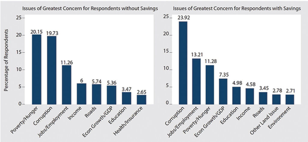 Furthermore, the lack of savings appears to influence citizens’ perception of issues of greatest concern. As shown in Figure 9, around one-in-five (20.15 percent) of those without savings are more likely to say poverty was the most important issue requiring the State’s action, compared to 11.28 percent of those with savings. Not having savings takes away from the otherwise large numbers of respondents concerned with corruption.