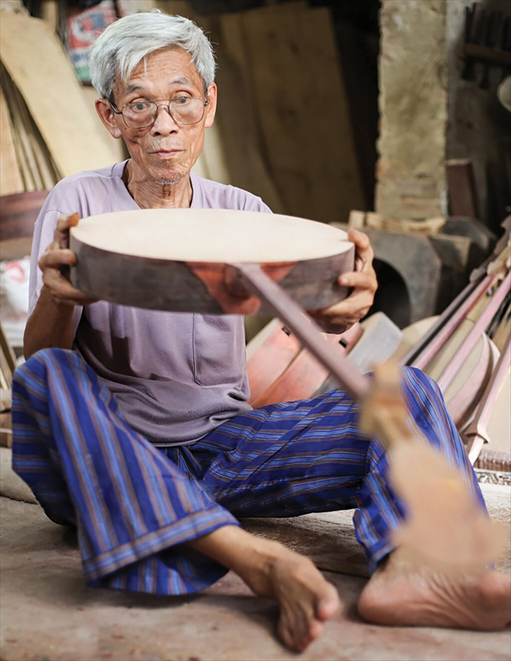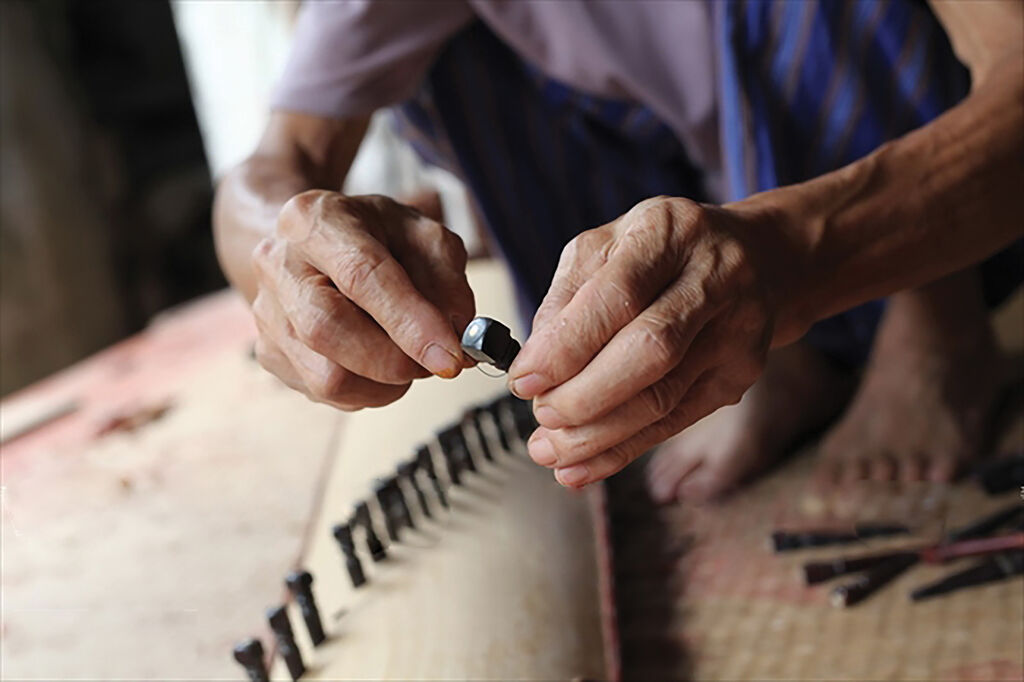 The making of an instrument by hand consists of several steps which require diligence, meticulousness, passion and love as well as experiences of a craftsman. It may take a month, even months, for a maker to finish a single instrument. Take the ty ba for example, a single piece of Chinese parasol tree timber needs to be collected and then dried for two to three years before it can be used. Next, a number of steps have to be followed, including splitting, carving and sanding, to shape the body, make the neck, and install strings. It is then sanded again and inlaid with mother-of-pearl. The instrument must have its sound tested before given to its owner.