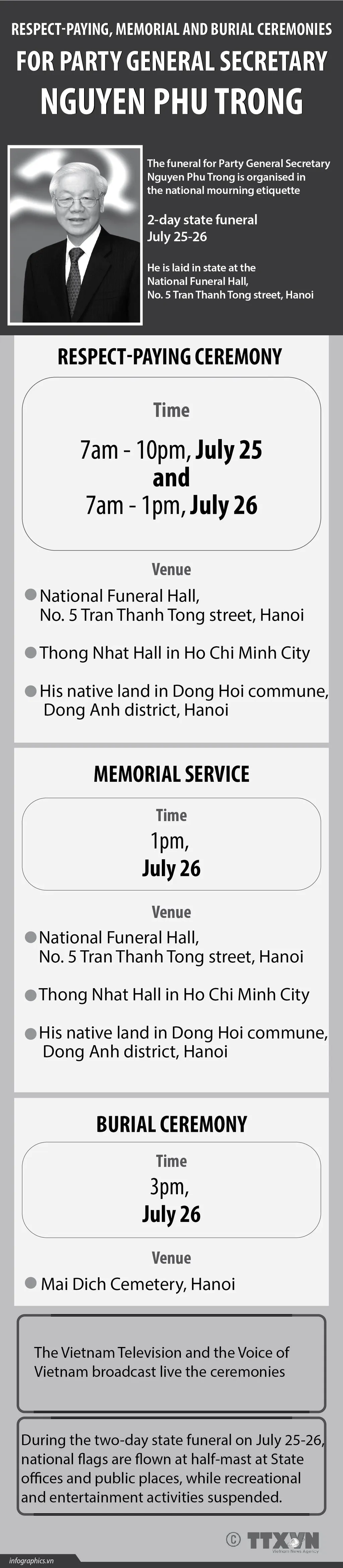 The funeral for General Secretary of the Communist Party of Vietnam Central Committee Nguyen Phu Trong is organized in the national mourning etiquette. The respect-paying and memorial ceremonies take place concurrently at the National Funeral Hall, No. 5 Tran Thanh Tong street, Hanoi, Thong Nhat Hall in Ho Chi Minh City and at the leader’s native land in Dong Hoi commune, Dong Anh district, Hanoi.