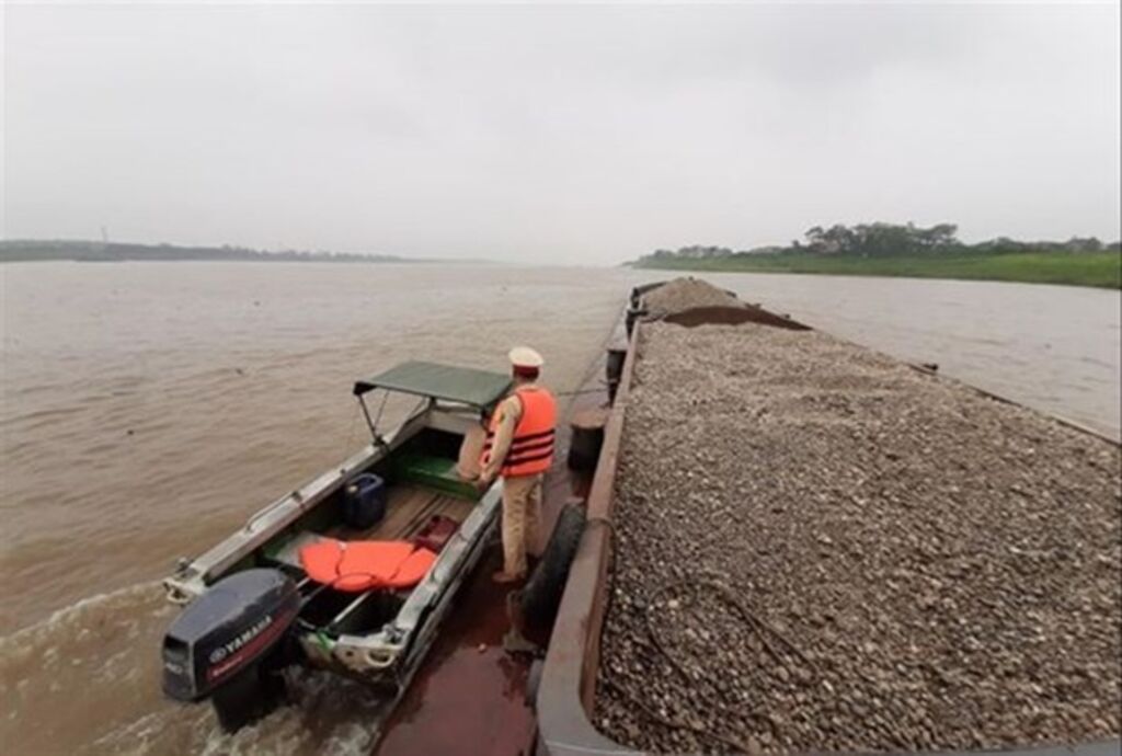 | A police officer inspects a barge carrying sand on the Red River__Photo: tienphong.vn |