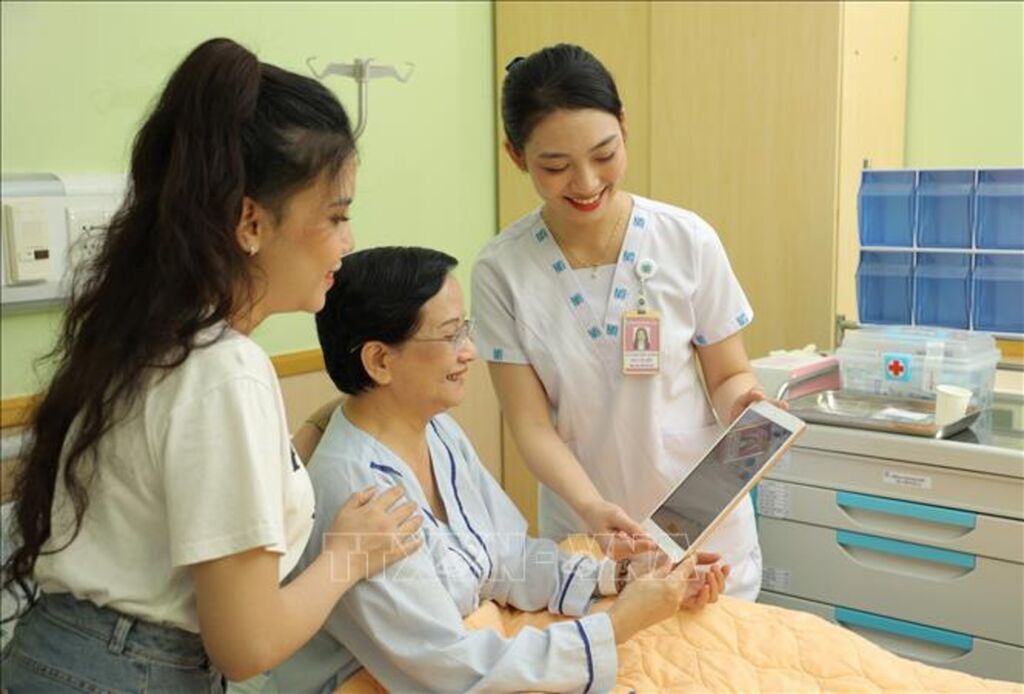 | A healthcare staff member at the University of Medicine and Pharmacy, Ho Chi Minh City, uses a tablet to update and share information with her patient __Photo: VNA |