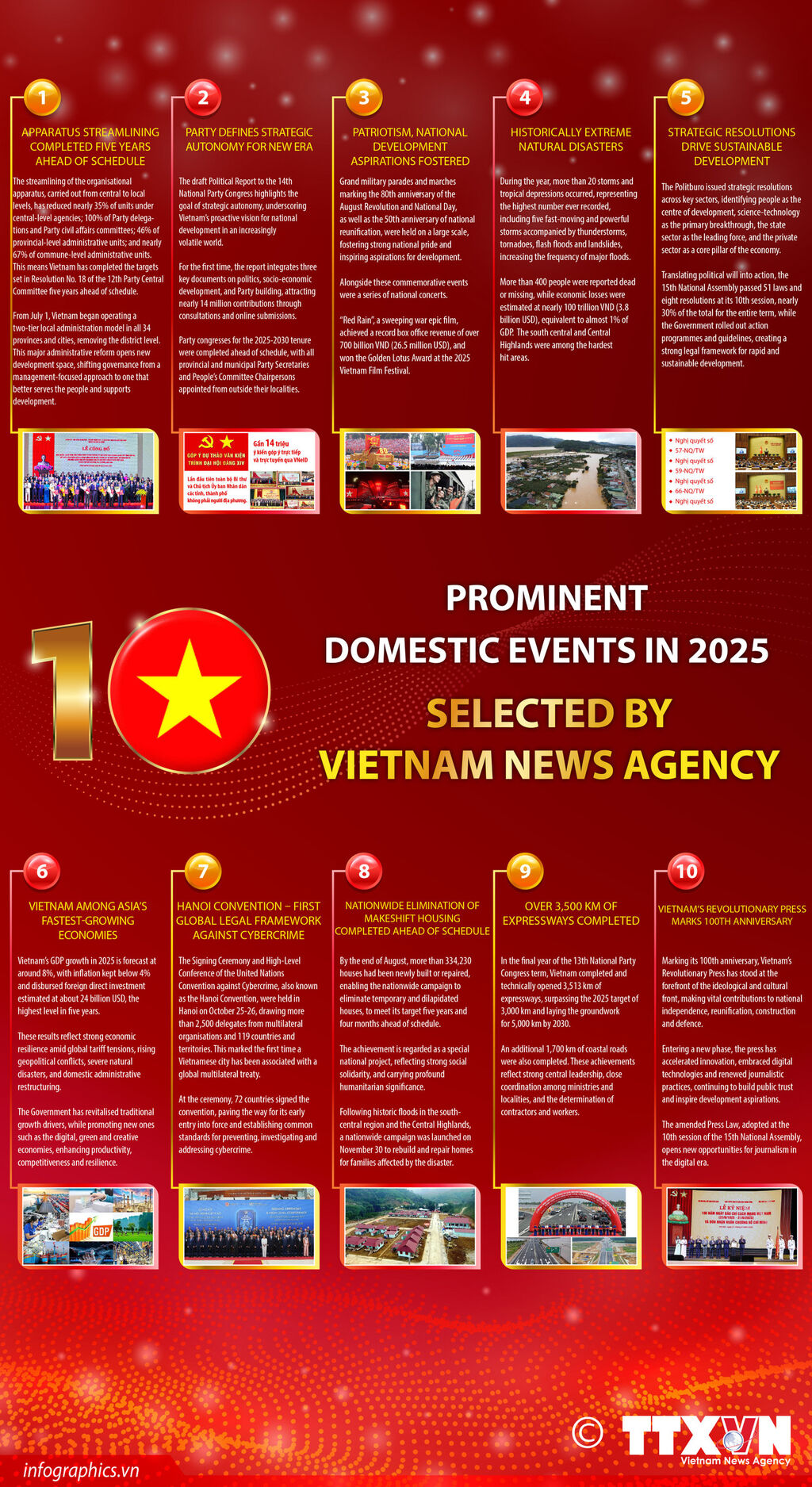As 2025 draws to a close, the Vietnam News Agency has selected the 10 most prominent domestic events of the year, reflecting major political, economic, social and cultural milestones.