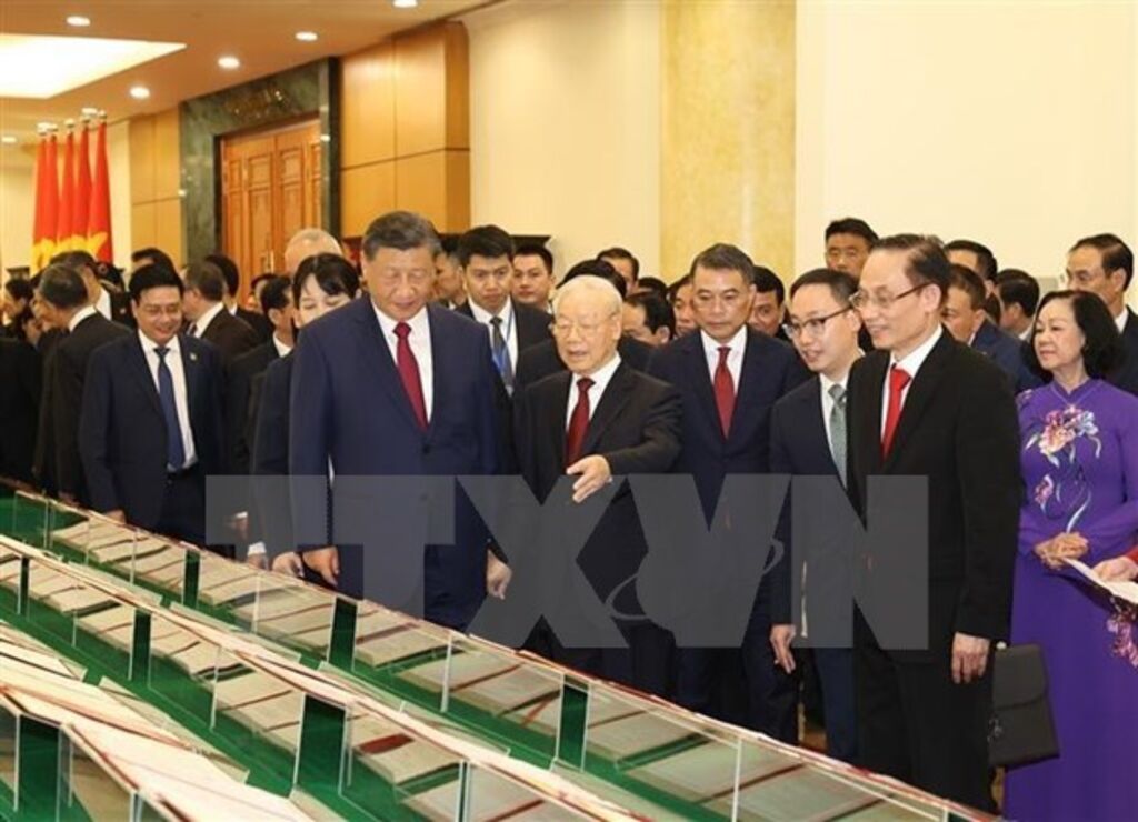 | Vietnamese Party General Secretary Nguyen Phu Trong and Party General Secretary and President of China Xi Jinping listen to the introduction of cooperation agreements in many fields signed between departments, ministries, sectors, and localities of the two countries.__Photo: VNA |