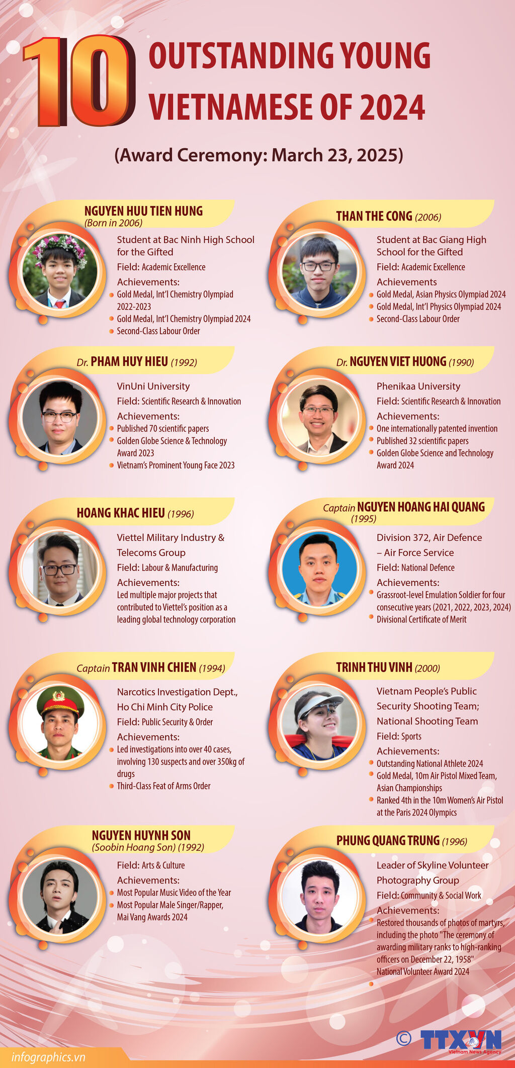 On the evening of March 23, the Ho Chi Minh Communist Youth Union, in collaboration with the Vietnam Young Talent Support Fund and Vietnam Television, hosted the award ceremony for the Outstanding Young Vietnamese of 2024. From 159 nominations across 55 organizations nationwide, the award council selected 10 exceptional young individuals who have demonstrated outstanding achievements in various fields, including academics, scientific research and innovation, labor and manufacturing, business and entrepreneurship, national defense, public security, sports, social work, and arts and culture.