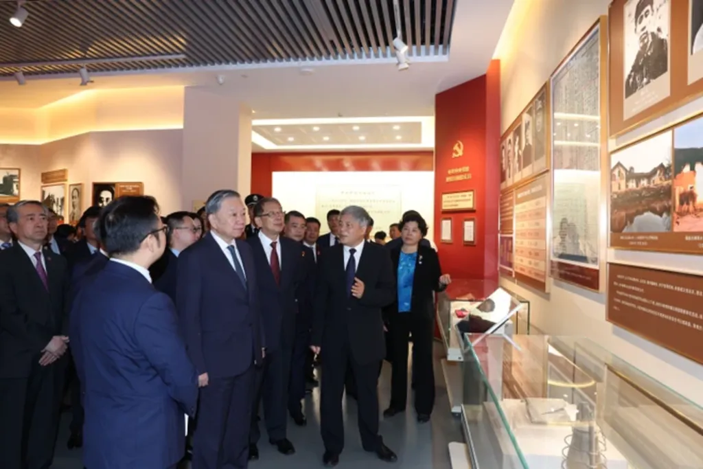 | General Secretary of the Communist Party of Vietnam Central Committee and President of Vietnam To Lam (front, second from left) visits the hall of traditions of the Central Party School of the Communist Party of China on August 20.__Photo: VNA |