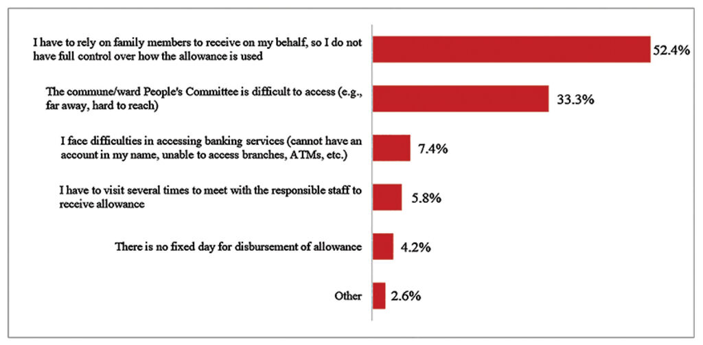 Among those who reported difficulties, as Figure 4 reveals, 52.4 percent said they had to rely on their family members to receive the allowance on their behalf. This leads to the lack of full control over how their allowance is managed. Additionally, 33.3 percent indicated that the commune/ward People’s Committees were difficult to access, often due to being far away or hard to reach. A smaller percentage (7.4 percent) of the respondents faced challenges with banking services: not being able to open accounts under their names or having difficulty accessing bank offices. Other barriers included the need to visit multiple times to meet the responsible staff (for 5.8 percent of the respondents) and the lack of a fixed schedule for disbursing allowances (for 4.2 percent).