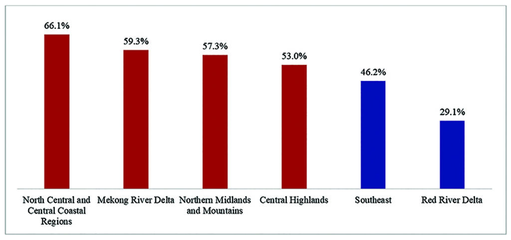 Regional disparities further contribute to the digital divide. As shown in Figure 7, in less developed areas such as the North Central and Central Coastal regions, 66.1 percent of the respondents said they had no access to the Internet. The percentages in the Mekong River Delta and the Northern Midland and Mountainous regions are 59.3 percent and 57.3 percent, respectively. In mountainous areas, inadequate electricity and Internet connectivity further limit connections for persons with disabilities.
