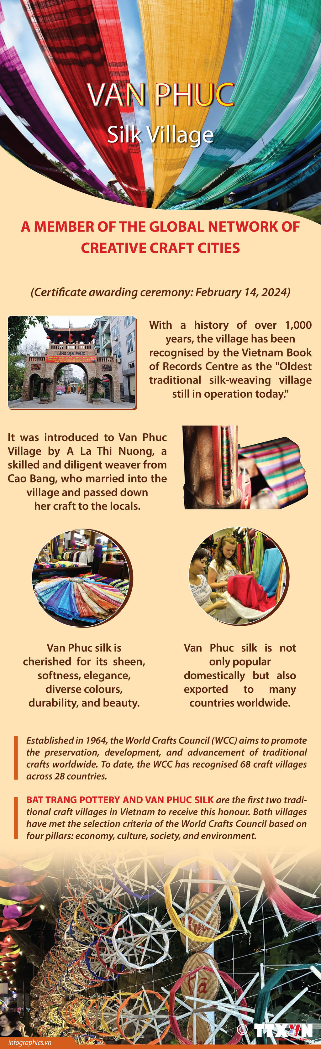 Van Phuc Silk Village, along with Bat Trang Pottery Village, has been recognized as a member of the global Network of Creative Craft Cities at a recent ceremony in Hanoi. Despite historical fluctuations, Van Phuc silk weaving has endured for over ten centuries and continues to thrive as a renowned traditional craft of the imperial capital. Today, Van Phuc silk remains popular domestically and is also exported to numerous countries worldwide.