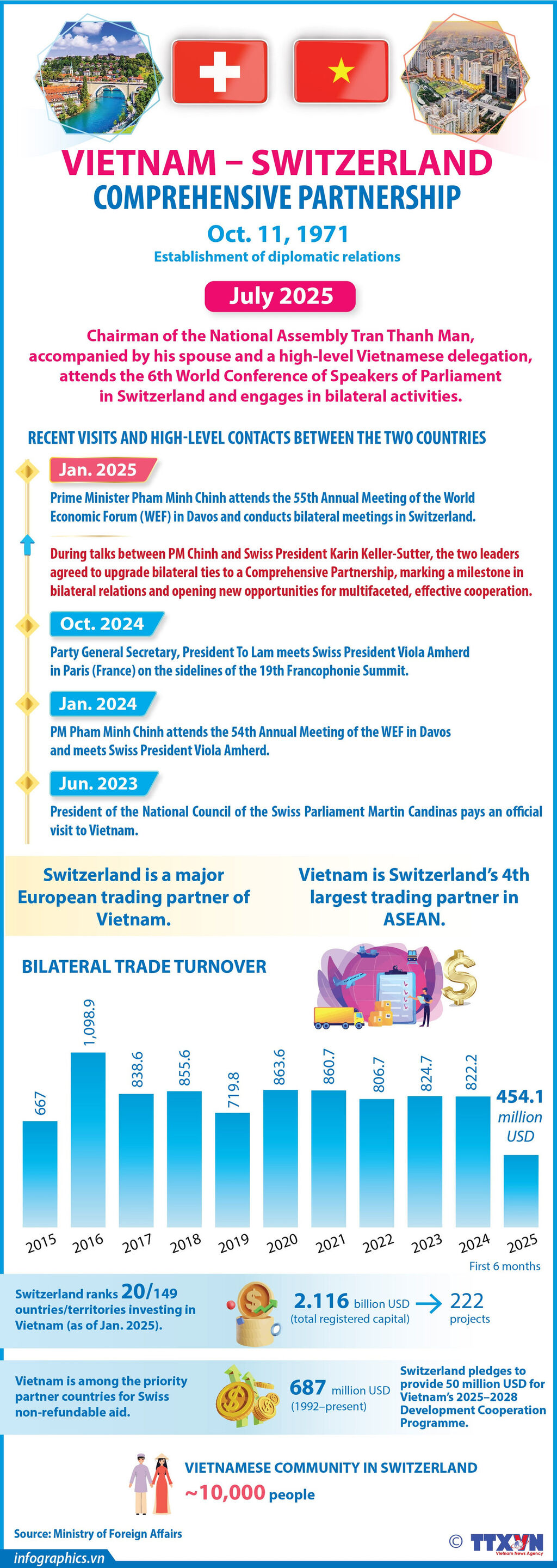 National Assembly Chairman Tran Thanh Man’s first official visit to Switzerland aims to reinforce political trust and deepen the Vietnam–Switzerland Comprehensive Partnership while promoting cooperation across various sectors.
