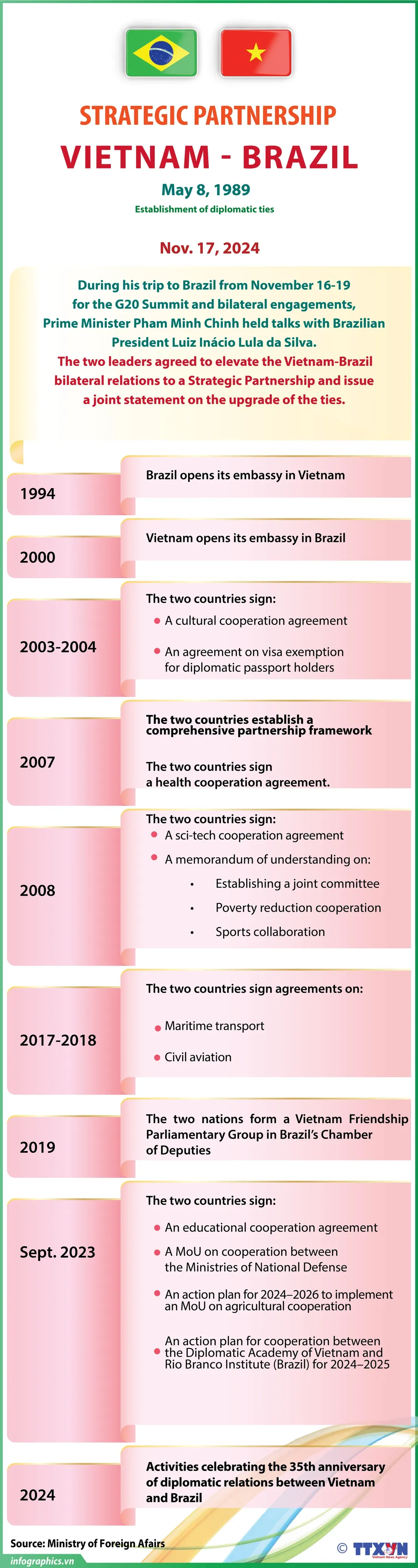 During his trip to Brazil from November 16-19 for the G20 Summit and bilateral engagements, Prime Minister Pham Minh Chinh held talks with Brazilian President Luiz Inácio Lula da Silva. The two leaders agreed to elevate the Vietnam-Brazil bilateral relations to a Strategic Partnership and issue a joint statement on the upgrade of the ties.