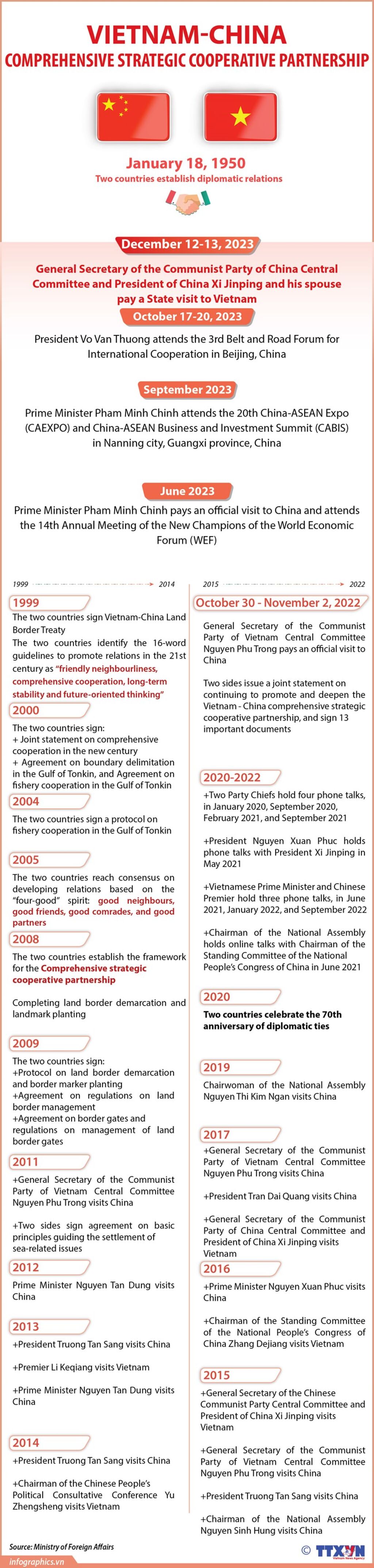 General Secretary of the Communist Party of China Central Committee and President of China Xi Jinping and his spouse pay a State visit to Vietnam. The visit on December12-13 is made at the invitation of General Secretary of the Communist Party of Vietnam Central Committee Nguyen Phu Trong and his spouse, and President Vo Van Thuong and his spouse.