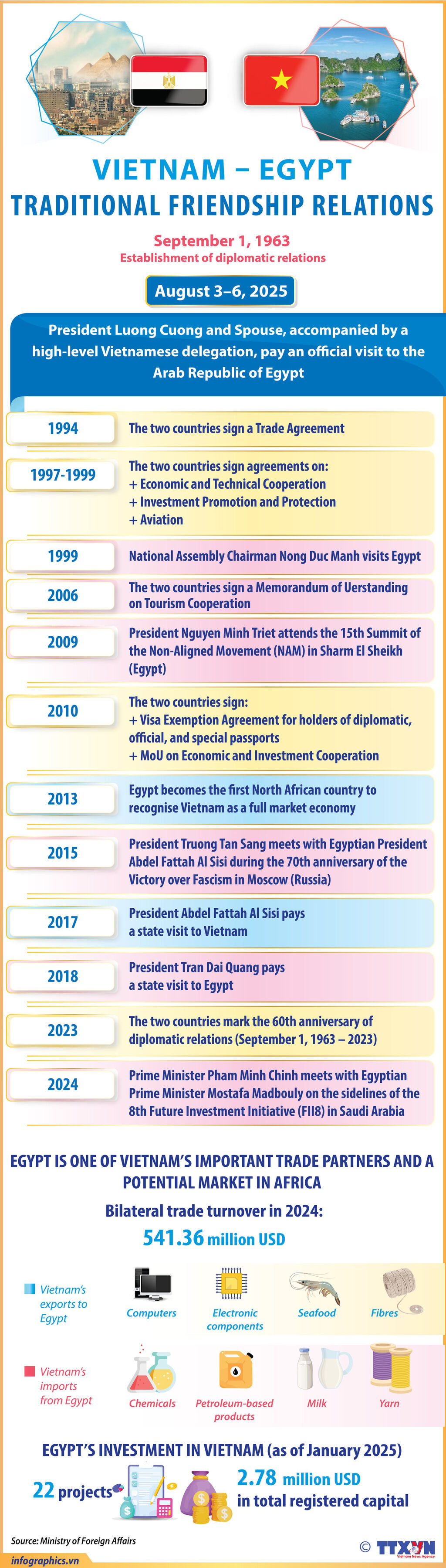 At the invitation of President of the Arab Republic of Egypt Abdel Fattah Al Sisi and his spouse, President Luong Cuong, his spouse, and a high-level Vietnamese delegation are paying a State visit to Egypt from August 3 to 6, 2025.