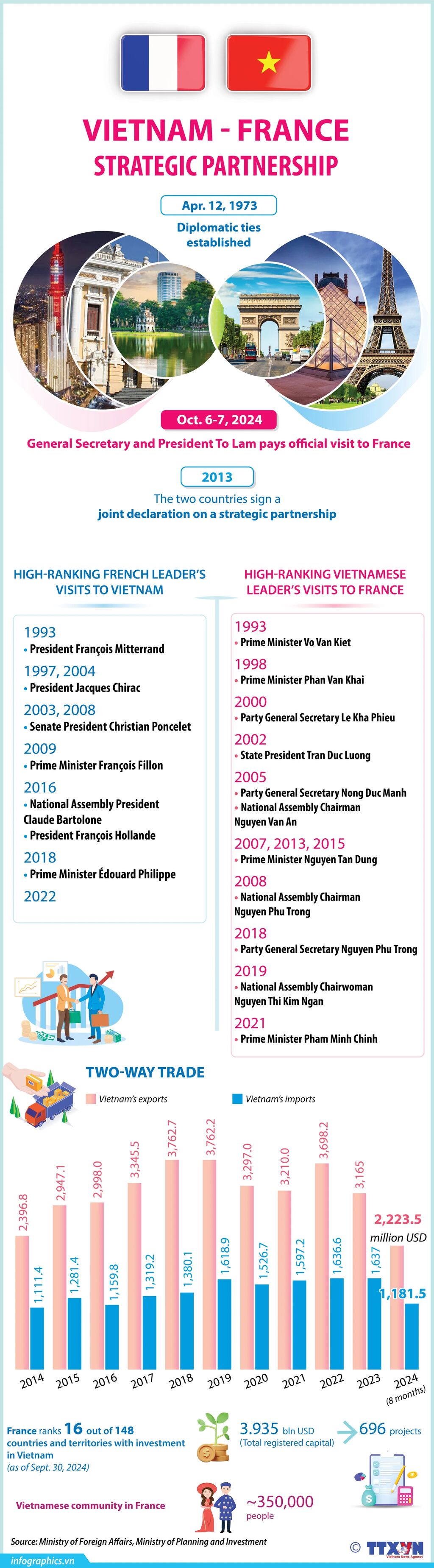 The visit to France from October 6-7 by Party General Secretary and State President To Lam takes place amid positive developments in the relations between the two countries. It demonstrates Vietnam’s high regard for the strategic partnership with France, and aims to deepen and make the ties more practical.