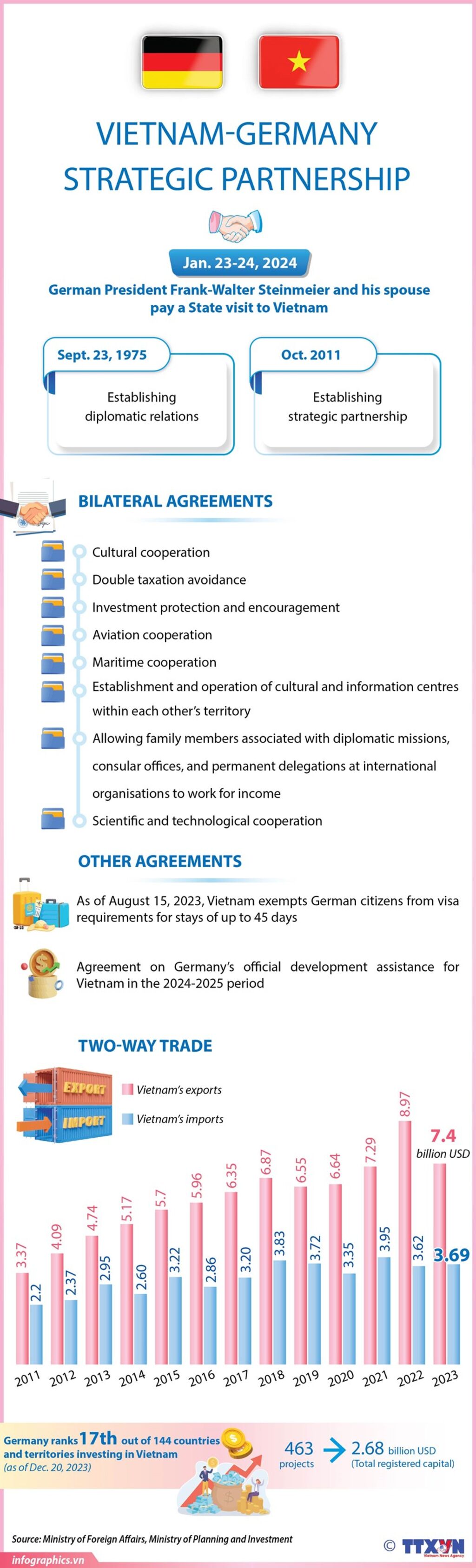 German President Frank-Walter Steinmeier and his spouse will pay a State visit to Vietnam from January 23-24 at the invitation of President Vo Van Thuong and his spouse.