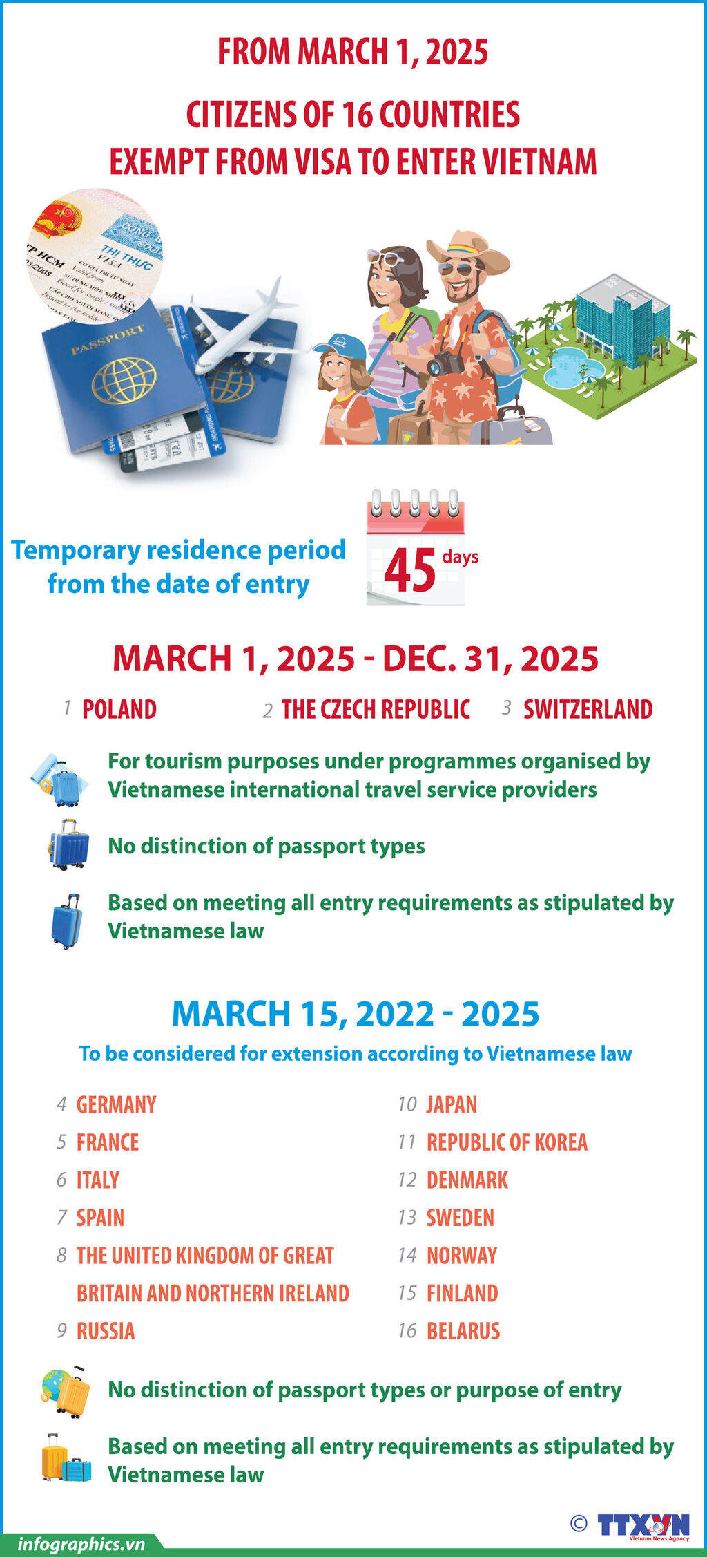 Vietnam grants visa exemptions to citizens of 16 countries from March 1, 2025 to December 31, 2025, as part of the country's tourism development stimulus program.