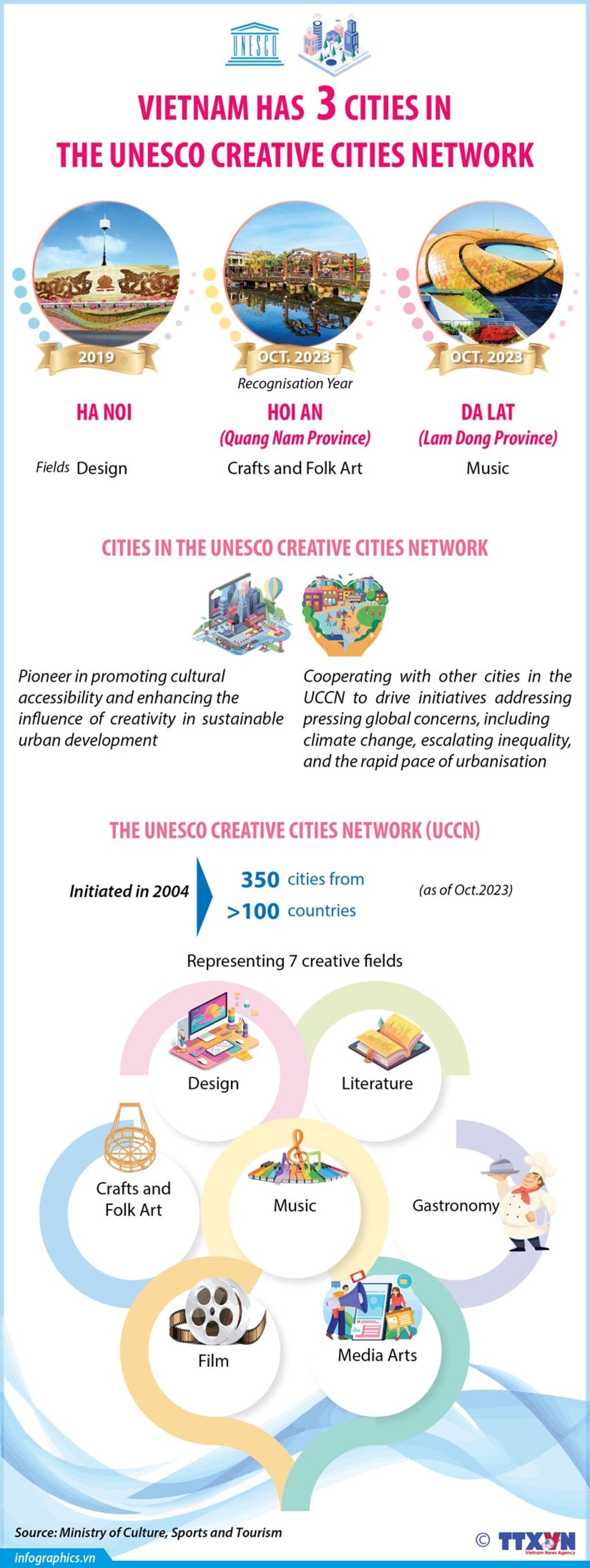 Two additional cities in Vietnam have been designated recently as UNESCO Creative Cities - Da Lat in the Central Highlands’ province of Lam Dong in term of music and Hoi An ancient town in the central province of Quang Nam in crafts and folk art. Vietnam now has three cities in the UNESCO Creative Cities Network (UCCN).