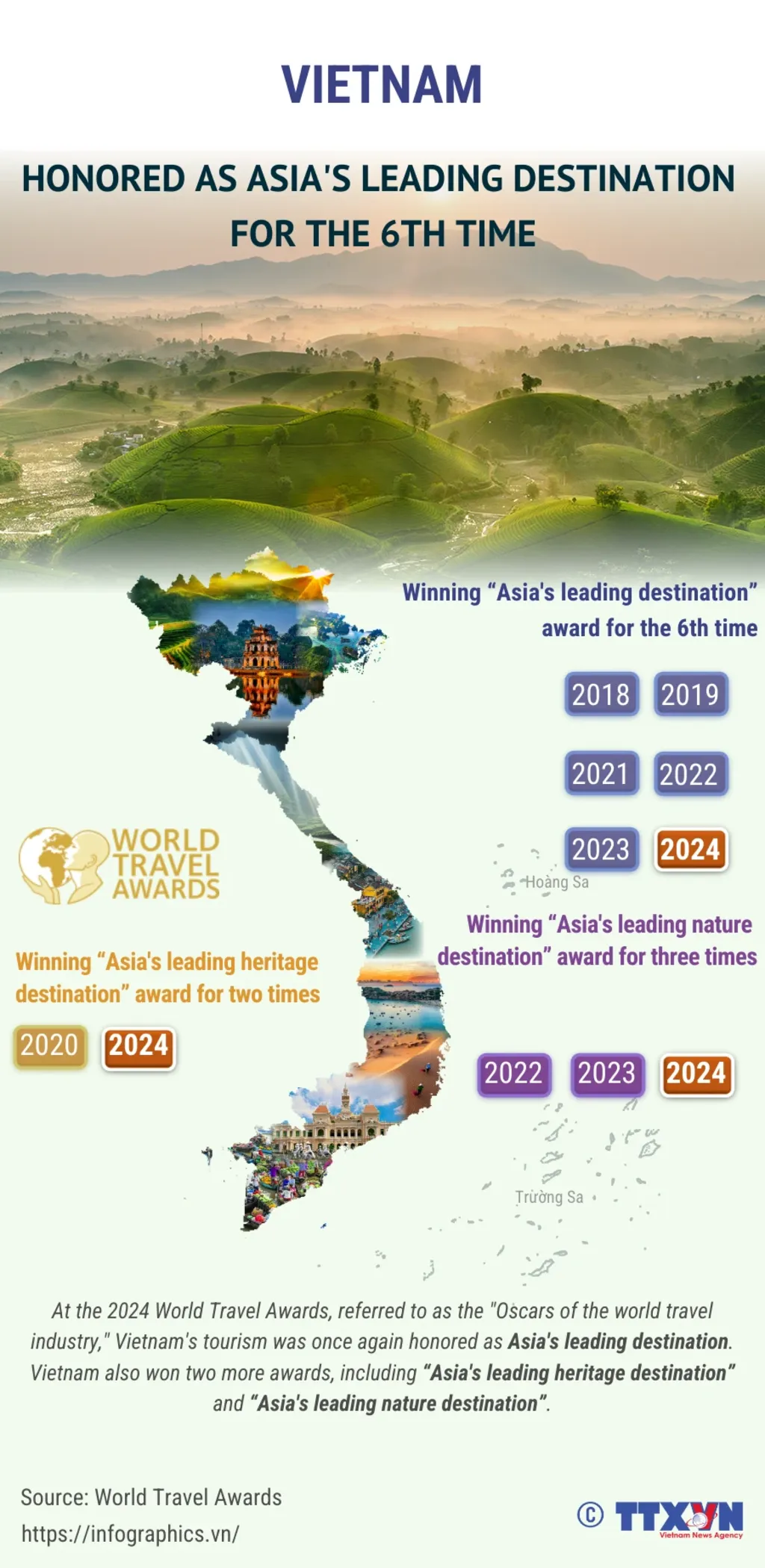 At the 2024 World Travel Awards, referred to as the "Oscars of the world travel industry," Vietnam's tourism was once again honored as Asia's leading destination. Vietnam also won two more awards, including “Asia's leading heritage destination” and “Asia's leading nature destination”.