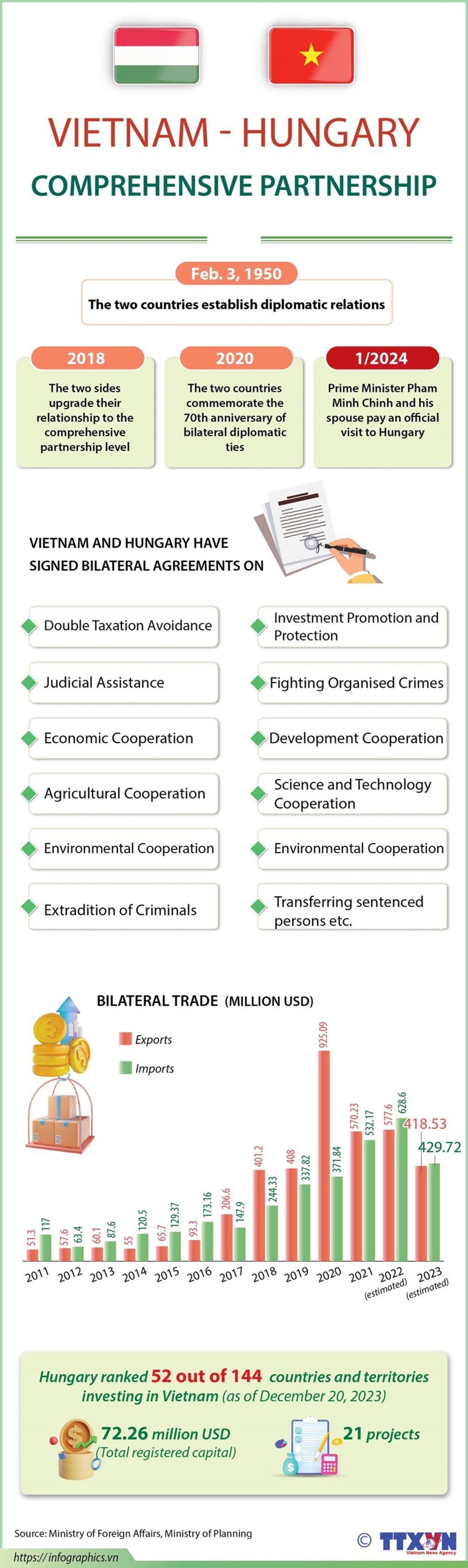 Vietnam and Hungary established diplomatic relations on February 3, 1950. The two countries have a traditional friendly relationship with a long history of more than 74 years. It has grown steadily since the two sides upgraded ties to a comprehensive partnership during Party General Secretary Nguyen Phu Trong’s visit to Hungary in 2018.