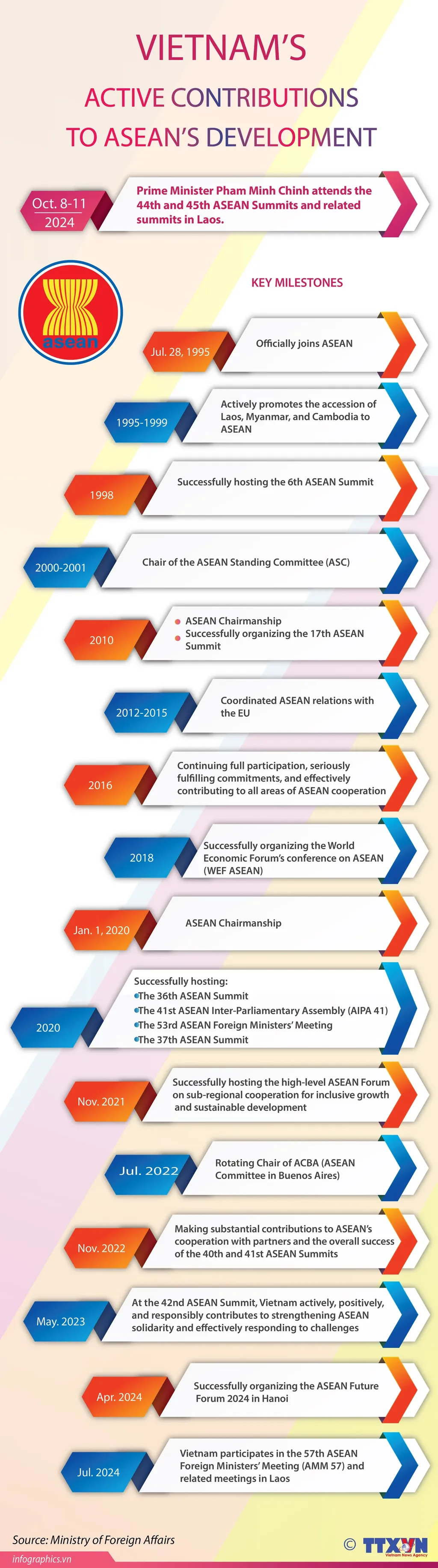 Vietnam, guided by the principles of proactivity, positivity, and responsibility, has made significant contributions to ASEAN cooperation throughout its journey with the organization. These efforts exemplify Vietnam's consistent spirit of peace, harmony, and friendship, all aimed at fostering stability and mutual prosperity. The nation is always dedicated to building a strong and united ASEAN, enhancing its role and prestige at both regional and global stages.