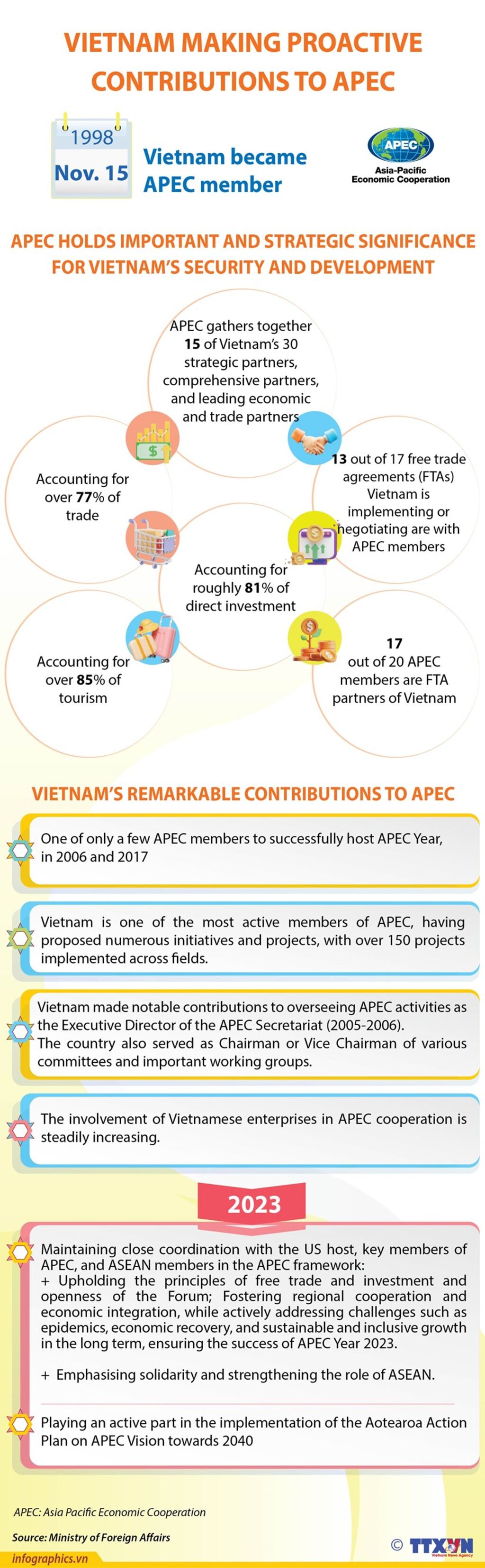 Vietnam became an official member of APEC on November 15, 1998, an important milestone in the implementation of its foreign policy. Over the course of its 25 years as an APEC member, Vietnam has actively and proactively contributed to the forum,playing a vital role in promoting peace, stability, cooperation, and regional economic integration.