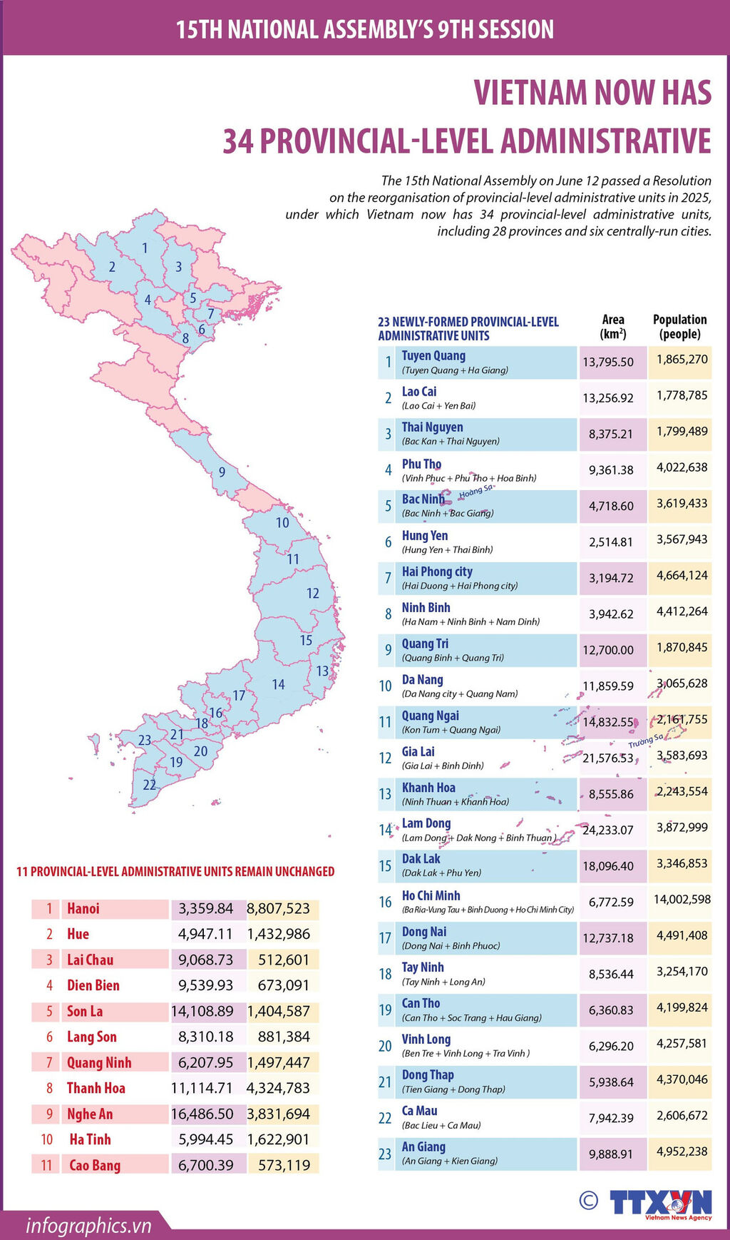 The 15th National Assembly (NA) on June 12 passed a Resolution on the reorganization of provincial-level administrative units in 2025, under which Vietnam now has 34 provincial-level administrative units, including 28 provinces and six centrally-run cities.