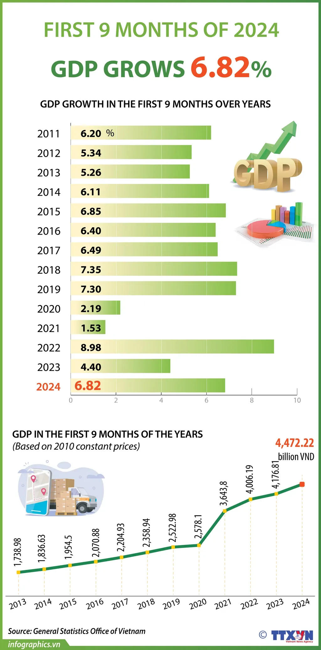 The GDP in the first 9 months of 2024 expanded by 6.82 percent compared to the same period in 2023. The GDP, based on 2010 constant prices, reached VND 4,472.22 trillion (around USD 180 billion ).