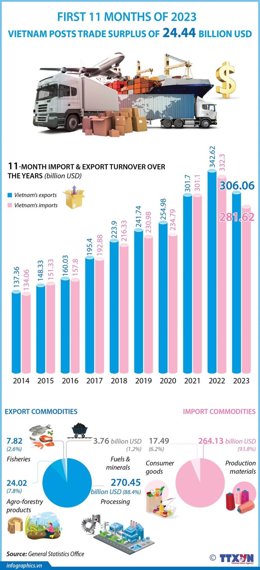 Vietnam had posted a trade surplus of USD 24.44 billion as of November 15, according to data released by the General Statistics Office.