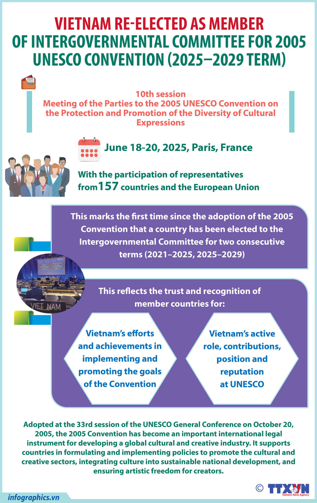 Vietnam has been re-elected for a second consecutive term (2021–2025, 2025–2029) as a member of the Intergovernmental Committee of the 2005 UNESCO Convention on the Protection and Promotion of the Diversity of Cultural Expressions.