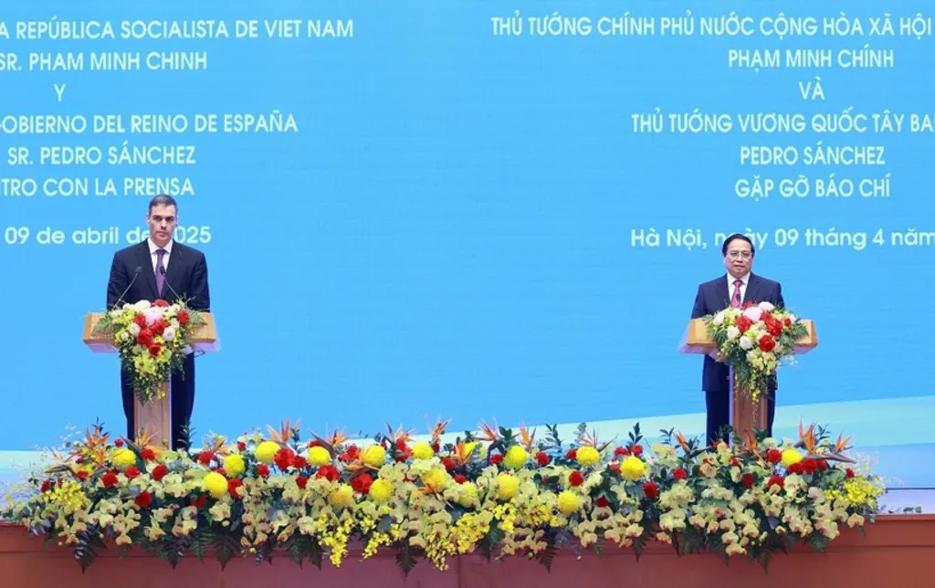 | Vietnamese Prime Minister Pham Minh Chinh (R) and President of the Government of Spain Pedro Sánchez co-chair a press conference in Hanoi on April 9 |