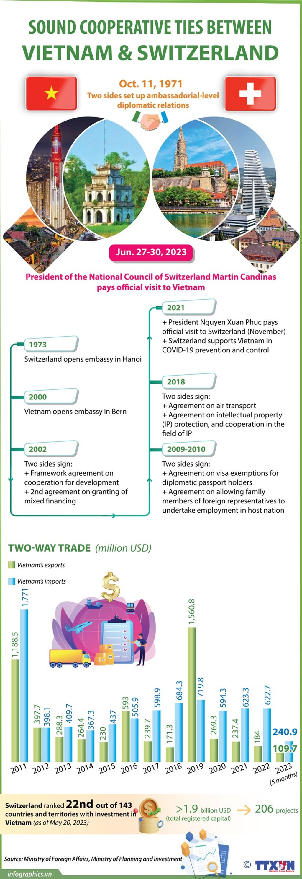 Vietnam and Switzerland have enjoyed thriving cooperation since they established ambassadorial-level diplomatic relations on October 11, 1971.