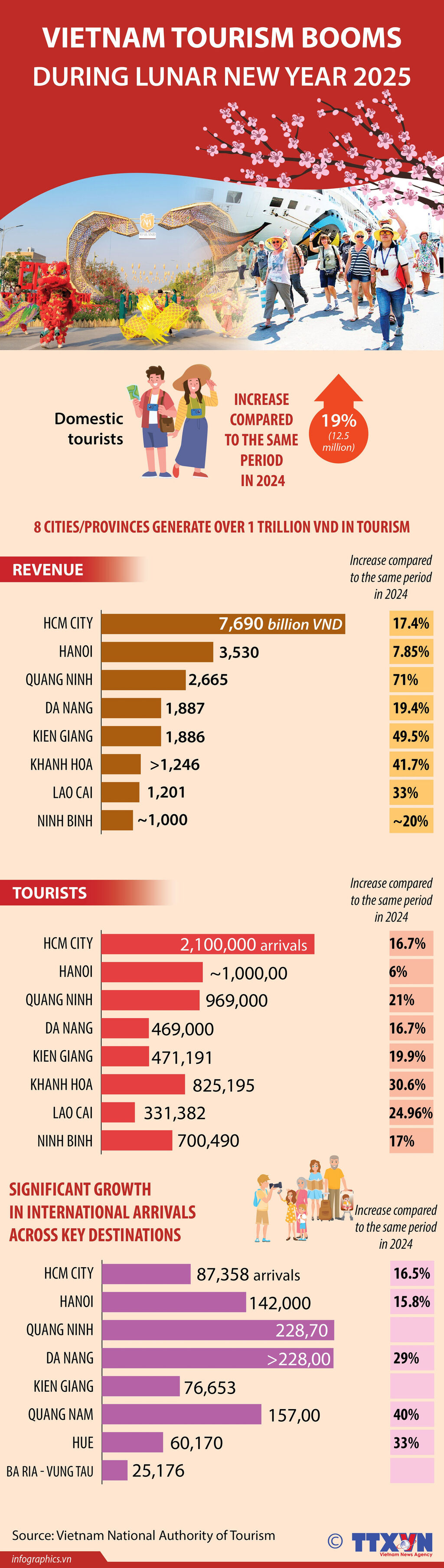 During the 2025 Lunar New Year holiday (January 25 – February 2, 2025), Vietnam’s tourism welcomed an estimated 12.5 million domestic tourists, up 19 percent year-on-year. International arrivals also saw an average growth of 30 percent. Notably, eight cities and provinces recorded tourism revenue exceeding VND 1 trillion (approximately USD 39.5 million).