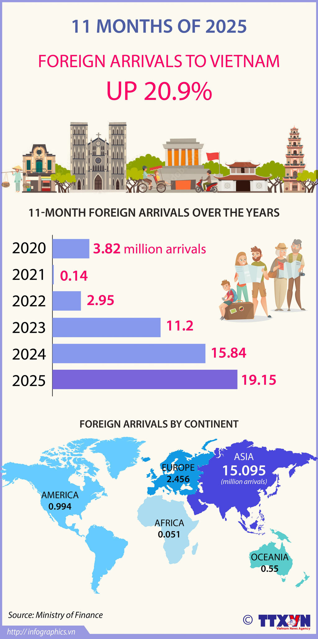 International arrivals to Vietnam reached 19.15 million in January-November 2025, up 20.9 percent year-on-year. In November alone, the country welcomed nearly 1.98 million visitors - the highest monthly figure ever recorded.