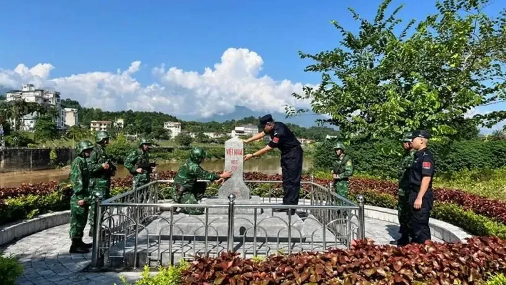 At the border demarcation line of the Lao Cai - Hekou International Border Gate, the patrol commands from both sides discussed joint patrol methods. They exchanged liaison officers to patrol within each other's teams, and each side established nine patrol units covering the area from Marker No. 87 in Y Ty commune, Bat Xat district to Marker No.167 in Pha Long commune, Muong Khuong district.