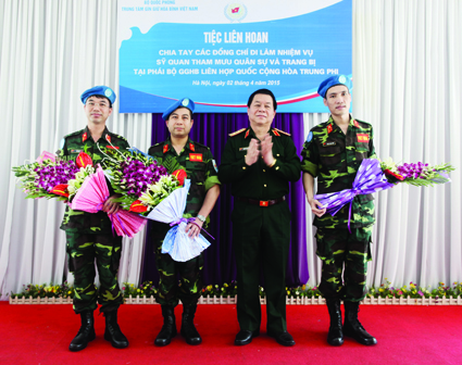 | Lieutenant General Nguyen Trong Nghia (second from right) greets three Vietnamese officers for their role as military liaison officers in the UN Peacekeeping Mission in the Central African Republic __Photo: Nguyen Hong Pha/VNA |